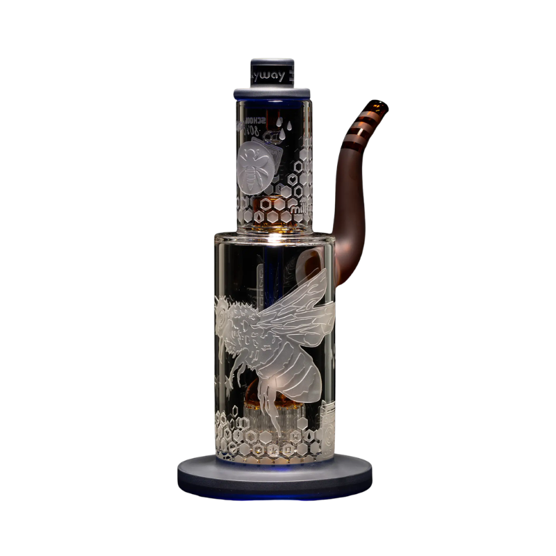 The Hash Hive 9″ Hash Rig from Milkyway Glass blends functional engineering with immersive Hive‑collection artistry. Standing 9 inches (23 cm) tall and weighing 0.7 kg, this piece is crafted from 5–7 mm thick borosilicate glass, offering durability while maintaining clarity and intricate detailing. Available in distinctive colorways—Clear & Pink, Teal, Dark Blue, and Amber—it showcases Milkyway’s signature double‑layer sandblast, giving the hive patterns a multilayered, tactile depth inspired by retro ’80s aesthetics.